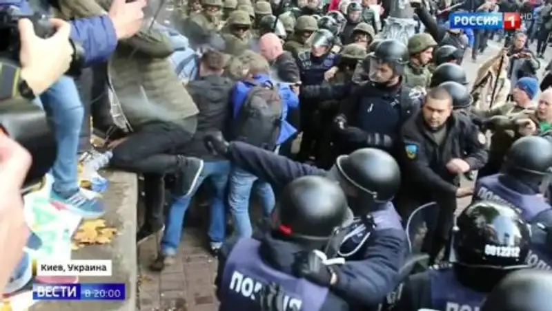 Верховная рада в нескольких кольцах оцепления. За этим периметром устанавливают палатки. Уже есть первые раненые, и все в дыму от слезоточивого газа. Так сейчас выглядит центр Киева. Лицо протеста на этот раз неукраинское. Лицо протеста — Михаил Саакашвили. Он за пару недель до сегодняшнего дня назвал дату 17 октября. И пока у него все получается. Депутатов не выпускают, требуют, чтобы они сняли с себя неприкосновенность. Надолго ли это осеннее обострение, пока не понятно. Но Петру Порошенко должно быть тревожно, передает Вести.ru