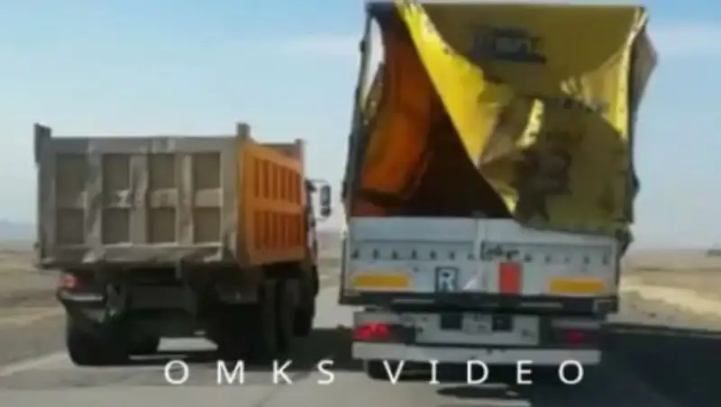 В социальных сетях появилось видео, как на трассе близ Каратау грузовик с казахстанскими номерами прикрывает от ветра фуру из Кыргызстана