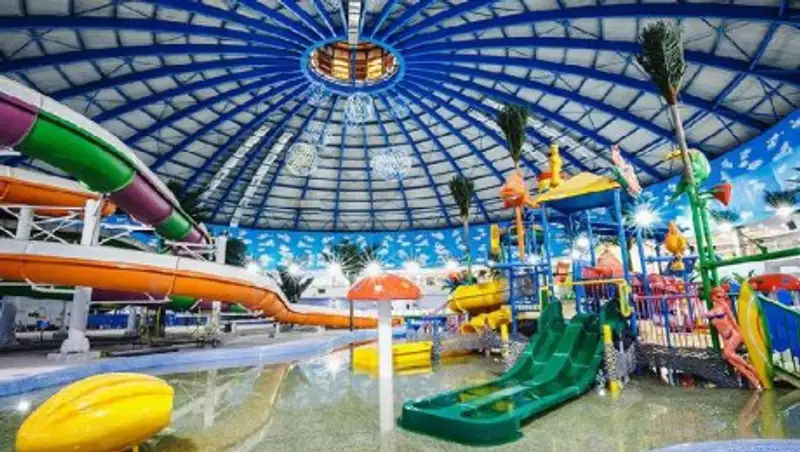 Развлекательный комплекс включает в себя водный парк с аттракционами, раздевалки, бани, зоны отдыха и фудкорт.