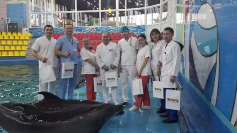 Арсен Тусупбаев – заведующий отделением эндоскопии Президентской клиники: «У них не один желудок, а целых три отсека. Мы были к этому готовы. Еще есть у дельфинов особенность с дыхательной системой – там в виде трубки отходит в сторону, поэтому нужно было действовать очень точно, чтобы не вызвать асфиксию. Мы сразу зашли эндоскопом, увидели инородные тела – фрагменты мяча красного цвета. Специальным инструментом захватили. Но когда вынимать начали, подтянули ближе – и тут у них такой жом пищеводный, очень плотный мышечный сфинктер не пускает. Тогда наш доктор Тынкозиев Женисбек Кадирбекович намазал руку маслом и рукой по эндоскопу зашел, схватил это инородное тело и вытащил таким способом оба фрагмента. Сделали ревизию, убедились, что ничего больше не осталось, потом ввели лекарство для восстановления и выпустили в воду. Надо сказать, что животное сразу стало активным, он начал прыгать, фигуры выполнять. Сегодня созванивались с администратором – нам сообщили, что дельфин прекрасно себя чувствует».