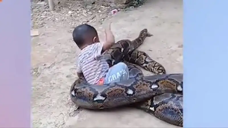 В Индонезии сняли видео, на котором малыш играет с огромным питоном.