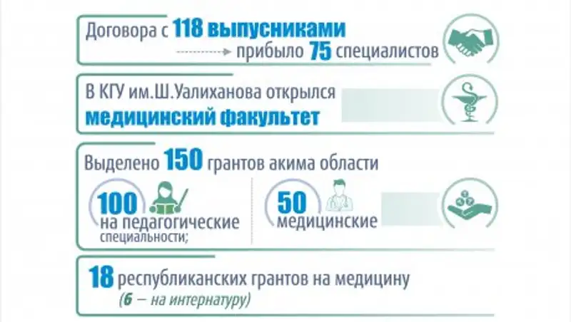 «На медицинские специальности выделено 18 республиканских грантов, в их числе 6 на интернатуру. Прорабатывается вопрос по выделению дополнительных 6 грантов на обучение интернов за счет областного бюджета», - отметил глава региона.