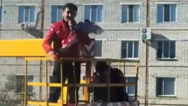 Мужчина на подъемнике с цветами в руках под музыку поднялся до уровня 4 этажа областного родильного дома.