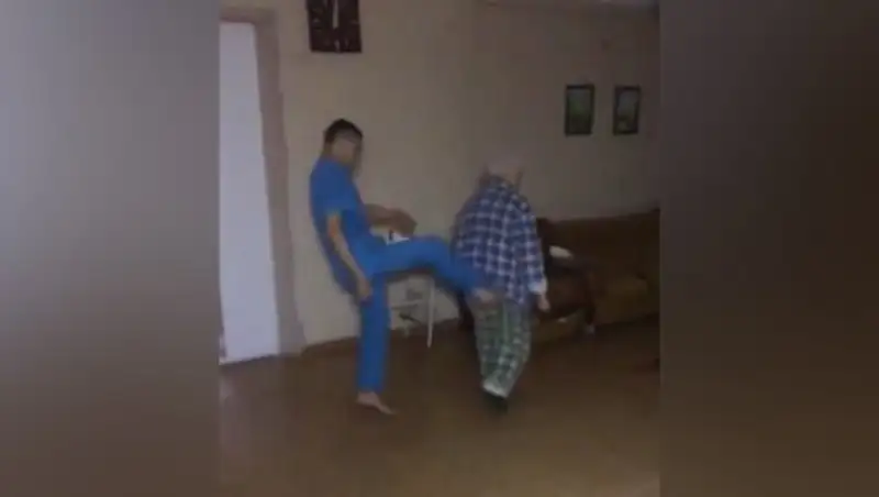 На кадрах видно, как медсотрудник бросает в дедушку тапок и пинает его. Происходящее сопровождается смехом его коллег.