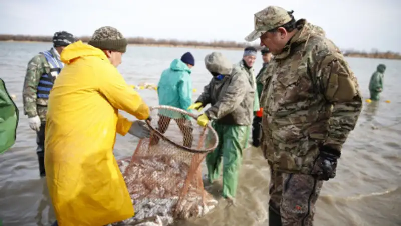 Аким области Нурлан Ногаев осмотрел баржи, наполненные свежевыловленной рыбой, поинтересовался у рыбаков – попадаются ли в сети мертвая рыба.