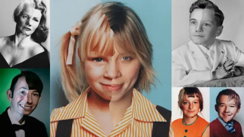 Этот метод он использовал для десятков других работ, которые объединил в серию "Возрастные карты" (AgeMaps). Вот как выглядят портреты-коллажи из половинок снимков, сделанных с интервалом в десятилетия: