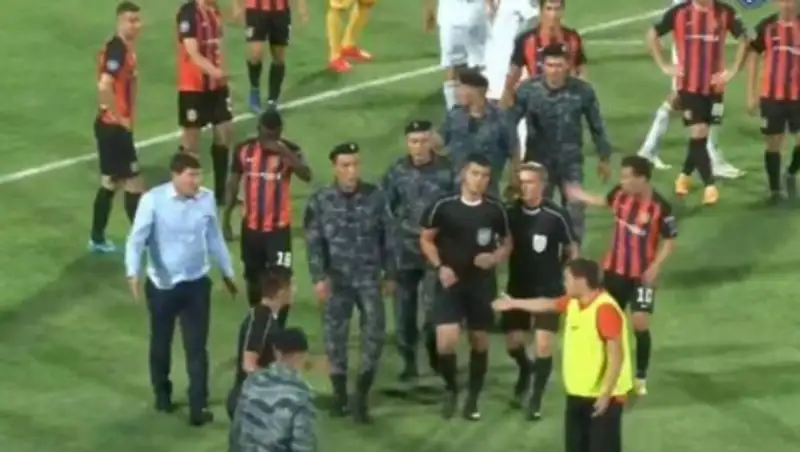 Это случилось в компенсированное время матча, который прошел 24 августа, в Шымкенте. На 96-й минуте при счете 2:2 главный судья Булат Сариев из Уральска назначил пенальти в ворота "Шахтера". Игроки и тренеры выражали недовольство и окружили арбитра.