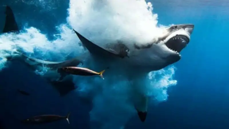 Первый приз фотоконкурса. Фото было сделано в тот момент, когда пятиметровая большая белая акула шла в атаку у побережья Гуадалупе.