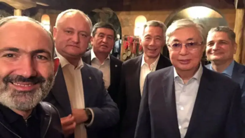 На фото слева направо стоят сам Пашинян, президент Молдовы Игорь Додон, Кыргызстана - Сооронбай Жээнбеков, премьер-министр Сингапура Ли Сянь Лун, президент Казахстана Касым-Жомарт Токаев и глава ЕЭК Тигран Саркисян.