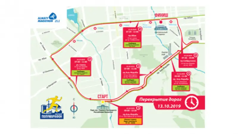 13 октября на время проведения Алматинского полумарафона с 00:00 до 12:30 будет временно перекрыто движение на дорогах для автотранспорта в местах прохождения маршрута, сообщает Zakon.kz.