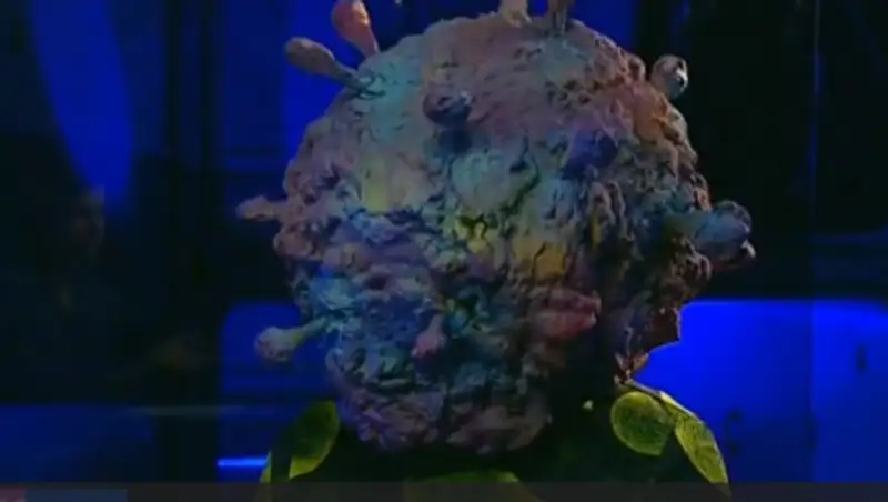 Ведущая пообщалась с образом коронавируса - человеком, одетым в костюм.