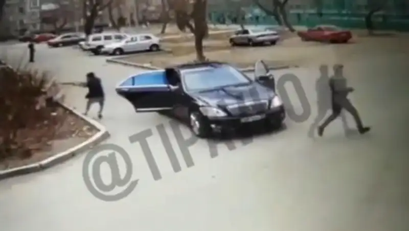 На нем у подъезда жилого дома стоит человек и курит. К нему подъезжает черный Mercedes. Из него выходит мужчина, открывает дверцу, вытаскивает из заднего сиденья что-то похожее на помповый дробовик и размахивая им, бежит в сторону подъезда. Человек с сигаретой убегает, из машины выходят еще двое, один из них так же идет в сторону подъезда. Затем автомобиль отъезжает на пару метров в сторону. Спустя несколько секунд возвращаются те двое, что бегали в подъезд, быстро садятся в автомобиль и они уезжают.