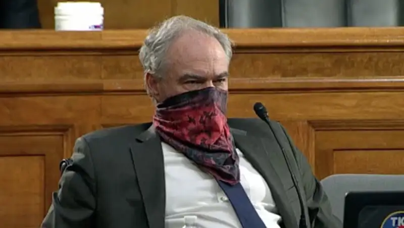 Политик пришел на заседание в маске, однако вместо привычной медицинской маски, Тим Кейн обвязал лицо красной банданой.