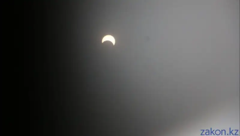 Максимальная фаза затмения в Казахстане была в 12:40, и в Алматы можно было наблюдать как Солнце было перекрыто Луной на 60%.