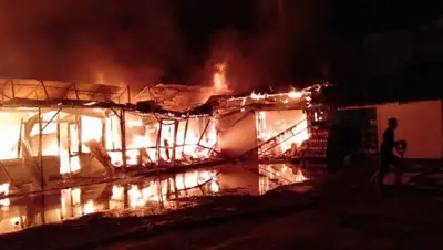 Как сообщили в пресс-службе КЧС МВД РК, сообщение о пожаре поступило 24 июня 2020 года в 04:40 часов. Горели продуктовые бутики, установленные вдоль поливного канала "Рамадан". Общая площадь пожара составила 250 кв.м.