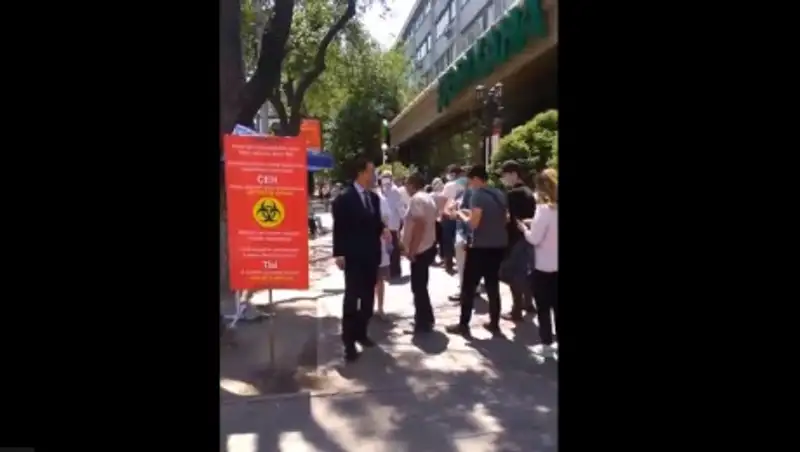 На записи видно, что он в сопровождении провизора общается со стоящими в очереди людьми.