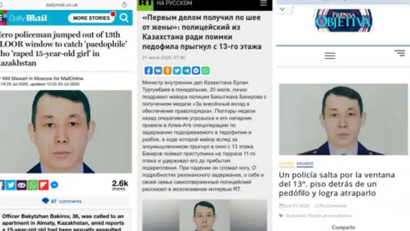 "Не могу представить, чтобы наша полиция могла делать так же", "Настоящий коп. Не то, что в Великобритании", – отметили читатели портала. А некоторые посетители сайта из США даже высказали пожелание, чтобы казахстанец приехал к ним и показал американским коллегам, как должен работать настоящий офицер полиции: "Ему нужно приехать в США и показать, как должны работать полицейские", "Суперкоп! Нам тоже нужны такие и побольше, а не те, которых хотят лишить финансирования". Американская пресса сравнила Бакытжана Бакирова с супер-полицейскими из голливудских фильмов. А колумбийская газета опубликовала громкий заголовок "Герой! Полицейский из Казахстана прыгнул в окно 13 этажа, чтобы задержать педофила". Новость о нашем сотруднике полиции вышла на английском, испанском, арабском, китайском и других языках.