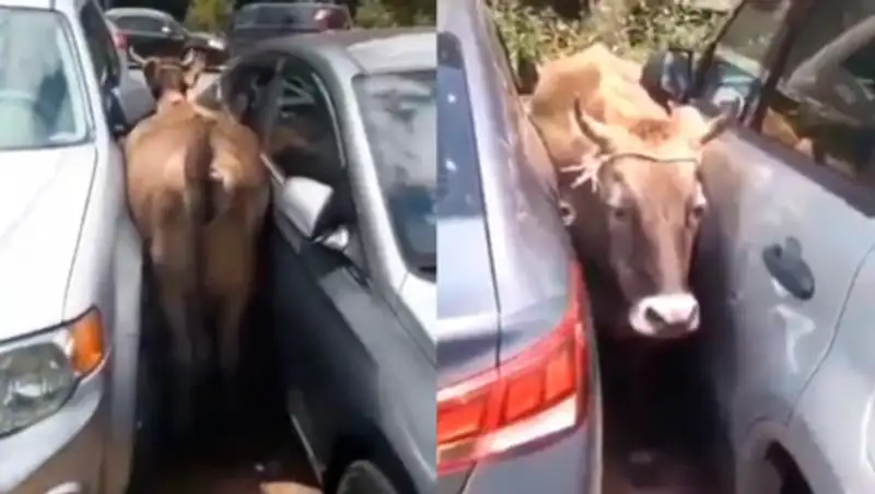 Зачем понадобилось одной из коров протискиваться между Hyundai Accent и кроссовером Ford Escape, остается только догадываться. Но рогатая застряла, а сзади к ней, воспользовавшись беспомощным положением "дамы", еще и пристроился молодой бычок.
