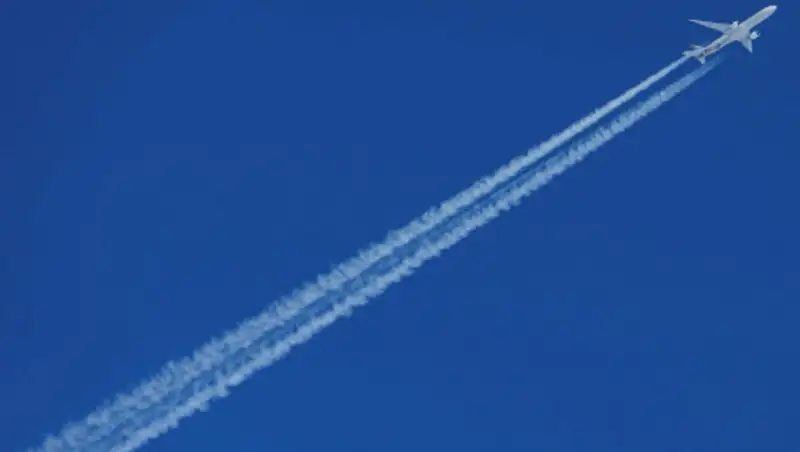Белый след за любым самолетом, который можно наблюдать с земли, — это конденсационный след. Особенно хорошо его видно в ясную погоду.