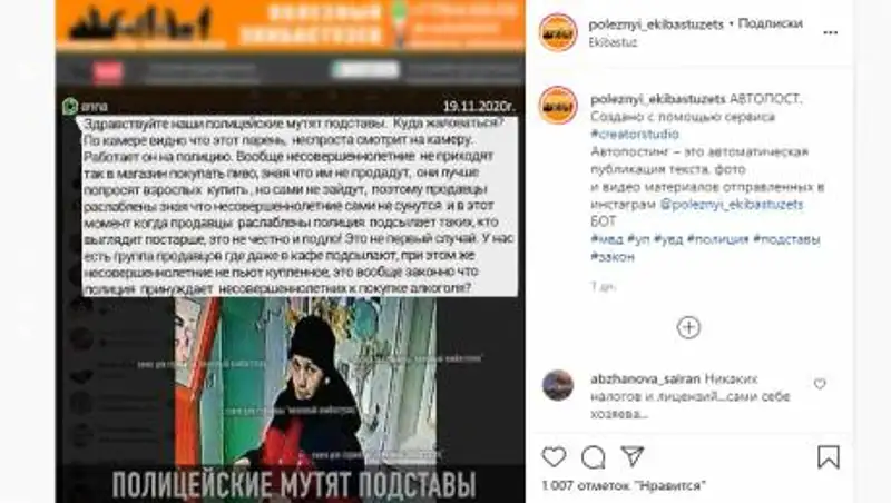 Жалоба на полицейских появилась несколько дней назад в instagram аккаунте "Полезный экибастузец".