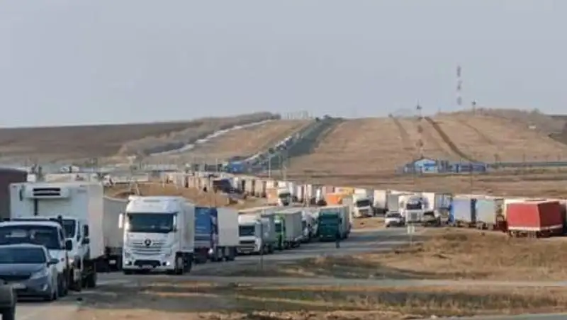 Вблизи пункта пропуска "Сырым", расположенного на казахстанско-российской границе (ЗКО), наблюдается скопление грузовых транспортных средств на выезд из Казахстана, сообщает zakon.kz.