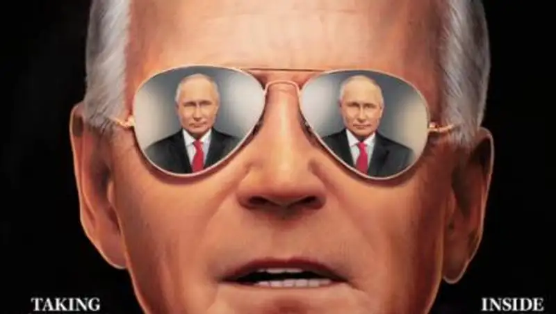 На обложке Путин отражается на солнцезащитных очках Байдена.