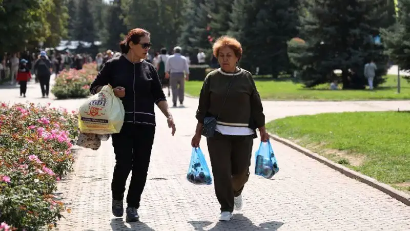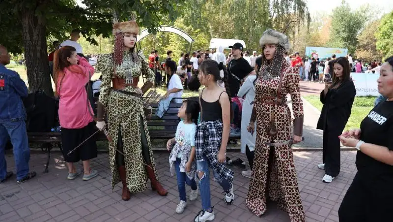 В парке звучат песни, посвященные Алматы, погода очень радует своим теплом, у горожан праздничное настроение, много семейных пар с детьми.