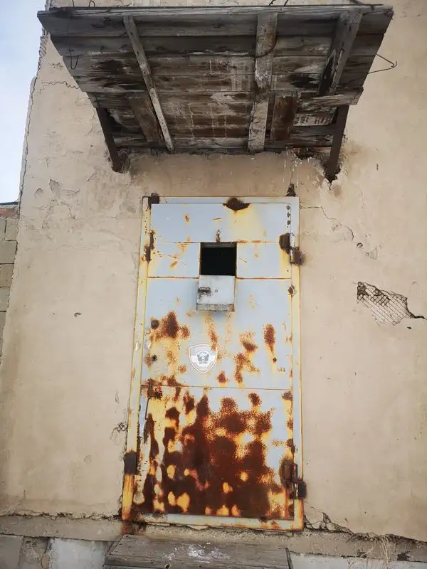 Посетителей встречает дверь сторожки, с той стороны строго спрашивают, зачем мы здесь? Узнав, что экскурсия проводится с разрешения акимата, охранник разрешает пройти.