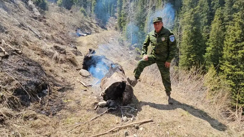 Даулет Жетписбаев показывает на тлеющее бревно, лежащее на тропе.