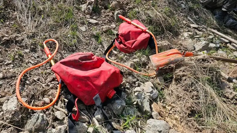 Примерно через 10 минут тяжелого подъема мы встретили группу пожарных национального парка. Огнеборцы отдыхали у горной тропы. Рядом с ними пустые специальные ранцы для тушения водой. Вместимость такого ранца – 20 литров. Работает он по принципу ручного насоса. Пожарные посетовали, что этого запаса воды мало, хватает на 10-15 минут работы. Но, с другой стороны, больше не возьмешь – тяжело.