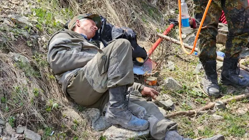 При подъеме Даулет Жетписбаев просит обращать внимание на верх крутых склонов. Оттуда в любой момент может скатиться тяжелое бревно или валун. Необходимо периодически смотреть наверх, и если услышишь крик "Бойся!", то нужно резко отпрыгнуть в сторону.