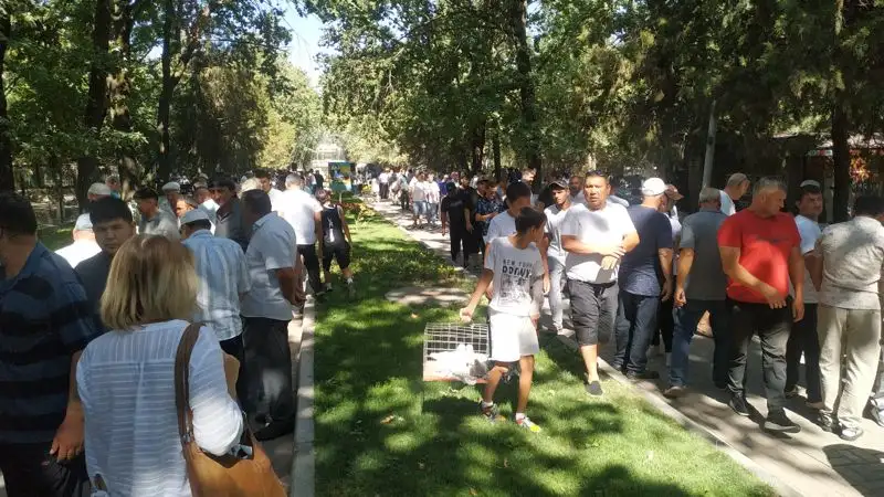 Шымкентский зоопарк и так не испытывает недостатка в посетителях, а сегодня, в субботу 5 августа, на центральной аллее просто не протолкнуться. По обе стороны аллеи выставлены клетки с необычайно красивыми голубями самых разнообразных цветов и видов. Хозяева птиц скромно теснятся позади клеток, занимая узкую полоску свободной земли.
