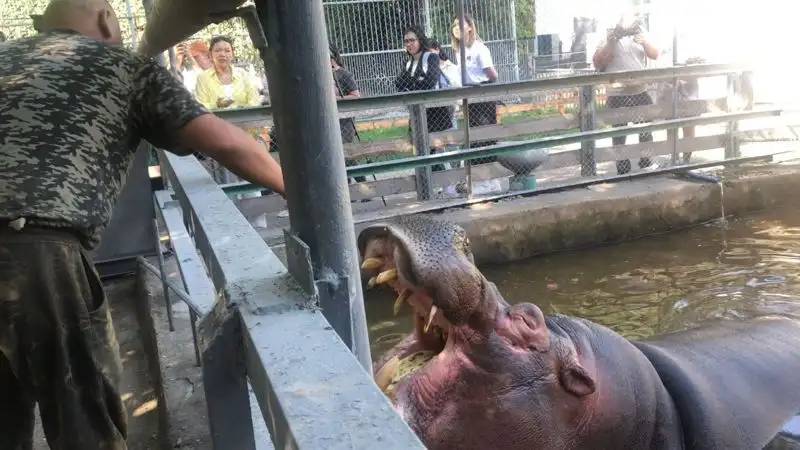Но журналистов далее ожидала не менее увлекательная программа: кормление бегемотов. Полная корзина с арбузами и бананами быстро опустела. Ведь у самца Джамбо хороший аппетит. Заведующий отделом копытных животных Болатбек Махатов рассказал, что в день животное съедает 45 килограмм разных лакомств.