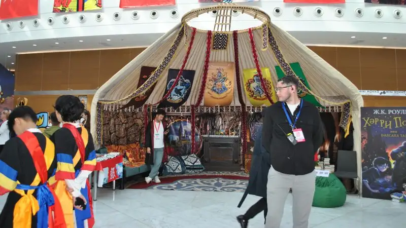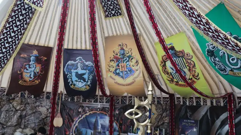 Переводу на казахский язык популярной саги о юном волшебнике Гарри Поттере на международном фестивале была посвящена полуюрта в самом центре холла. В антураже казахского национального круглого дома среди ковров и украшений идеально смотрелись символы факультетов Хогвартса.
