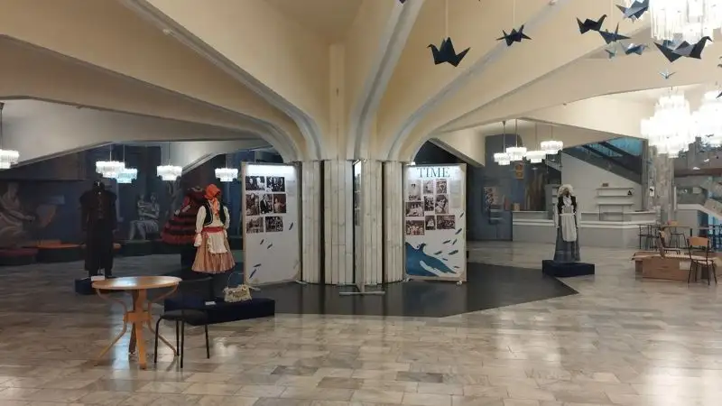 На выставке впервые представлены уникальные архивные документы и фотографии, раскрывающие историю жизни, становления и успеха Наталии Сац. Потолок украшают 120 синих птиц в технике оригами – как символ сбывшейся мечты основательницы театра, которая хотела дарить детям сказку.