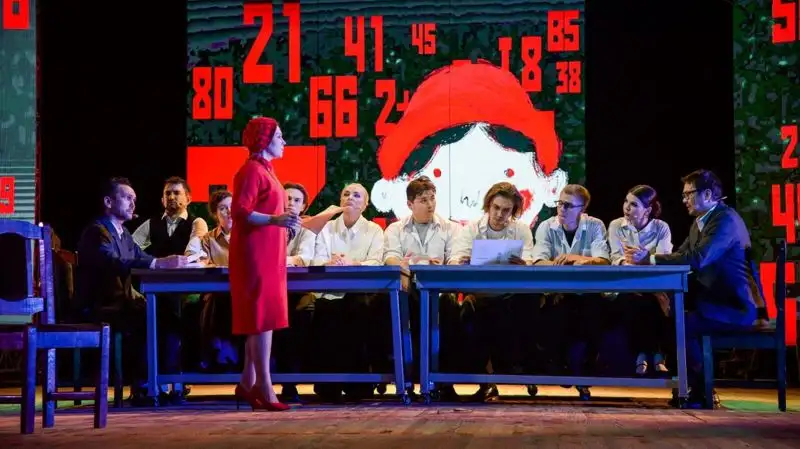 Одна из декораций, отсылающих почти на 80 лет назад – реплика первого занавеса театра, который был в 1945 году, именно он распахивается, приглашая на премьеру первых зрителей.