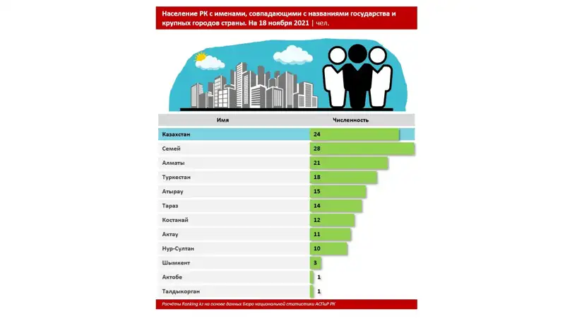 Казахстанцы называют детей и в честь крупнейших городов страны — в стране их 18. 28 человек в стране носят имя Семей, 21 — Алматы, 18 — Туркестан. Кроме того, в Казахстане проживают 15 человек с именем Атырау, 14 жителей — Тараз, 12 — Костанай, 11 — Актау, 10 — Нур-Султанов, три — Шымкента и по одному — Актобе и Талдыкоргану.
