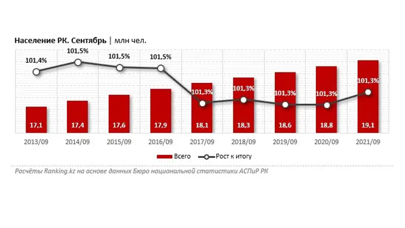 Как сообщается на Ranking.kz, на 1 октября 2021 года в стране проживало 19,1 млн человек — на 1,3% больше, чем годом ранее.