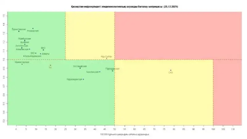 Минздрав опубликовал матрицу оценки эпидемиологической ситуации в регионах Казахстана на 25 декабря, сообщает Zakon.k