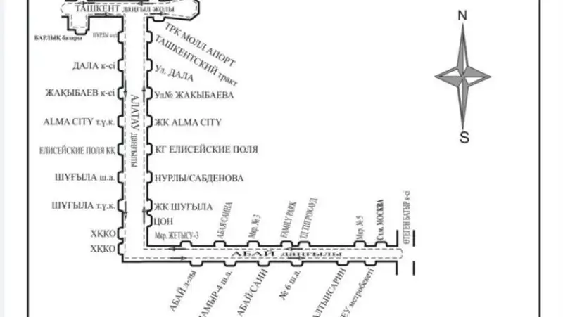 Новый маршрут будет курсировать по пр. Абая от ул. Отеген батыра до пр. Алатау. Затем двинется вниз до Ташкентского тракта, где свернет направо. После остановочного пункта «ТРК Молл апорт» маршрут развернется и поедет по Ташкентскому тракту в противоположенном направлении, где после остановочного пункта «Рынок Алтын орда» опять развернется, заедет на рынок Барлык, далее свернет на проспект Алатау и поедет согласно схеме в обратную сторону.