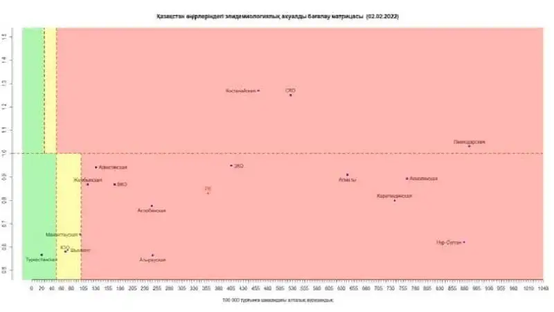 Согласно матрице оценки эпидемиологической ситуации в регионах Казахстана на 2 февраля 2022 года,