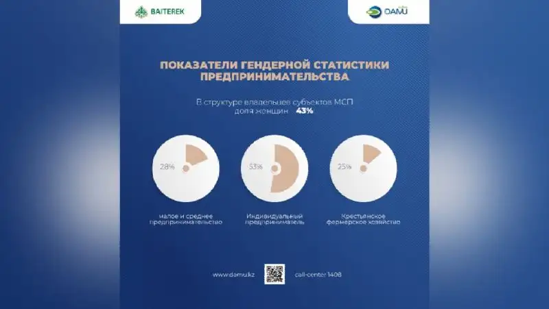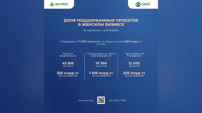 Из всех проектов, поддержанных фондом «Даму», 72,3 тыс. проектов, или более 46% – это идеи, воплощенные женщинами. Общая сумма господдержки бизнес-вумен составляет 1,26 млрд тенге. Фонд «Даму», как национальный институт развития по поддержке предпринимательства, уделяет большое внимание гендерному аспекту и поддерживает деловые инициативы женщин, – отметила председатель правления АО «Фонд развития предпринимательства «Даму» Гаухар Бурибаева.