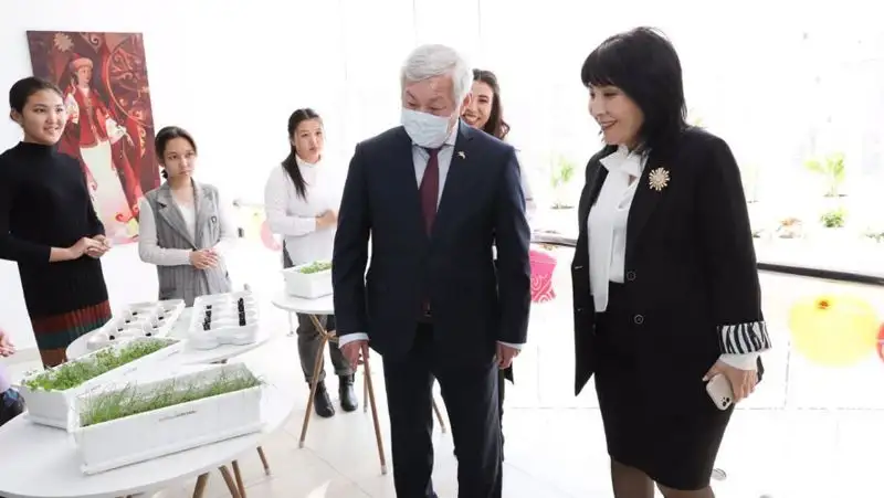 В центре «Анаға тағзым» Бердибек Сапарбаев ознакомился с выставкой картин, лоскутных изделий (құрақ көрпе), посетил кулинарную студию «Береке», эко-клуб «Қызғалдақ».