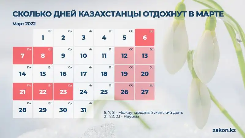 При шестидневной рабочей неделе казахстанцы отдохнут четыре дня подряд: 20, 21, 22, 23 марта.
