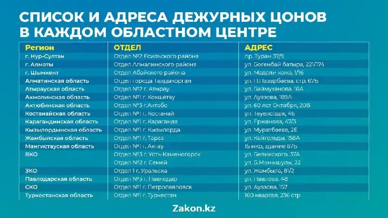 Список и адреса дежурных ЦОНов в каждом областном центре.