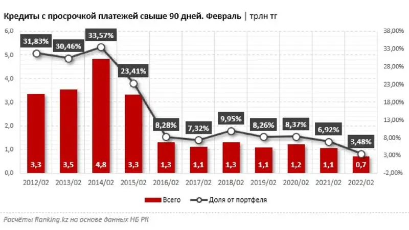 Впрочем, в банковском секторе нашлись игроки, показавшие эффективное сокращение просрочки за месяц. Так, по снижению объема займов с просрочкой платежей за февраль в топовой десятке банков-кредиторов страны лидирует Bank RBK: сразу минус 22%, до 29,4 млрд тг.