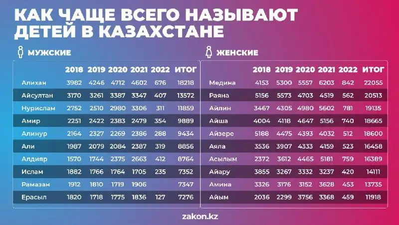 В 2021 году в Казахстане родились 450 тысяч детей, что является рекордом для страны. Однако 14,5% мальчиков и 25,5% девочек получили одно из 10 самых распространенных имен. Это приводит к большому числу тезок в детских коллективах, передает корреспондент Zakon.kz.