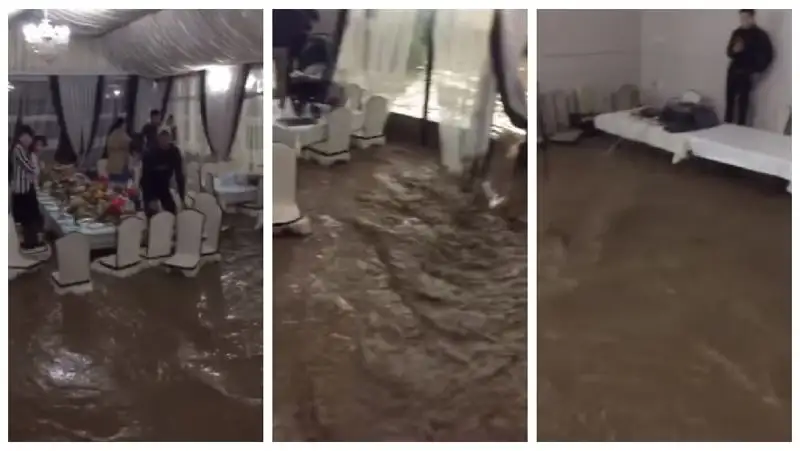 Казахстанцы распространяют видеоролик, снятый в Туркестанской области: в одном из ресторанов посетителям пришлось забраться на стулья из-за последствий сильного дождя, сообщает Zakon.kz.