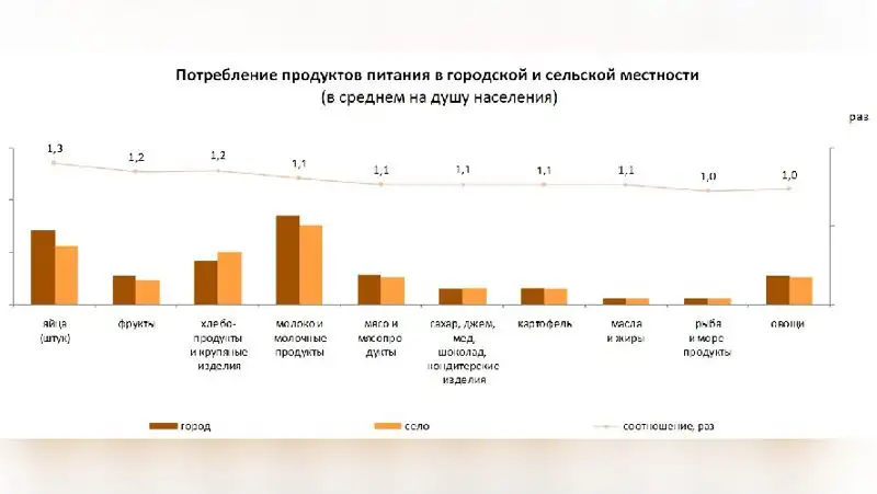 При сравнении потребления основных групп продуктов питания сельским и городским населением наибольшая дифференциация отмечается по потреблению яиц, хлебопродуктов и крупяных изделий, а также фруктов.