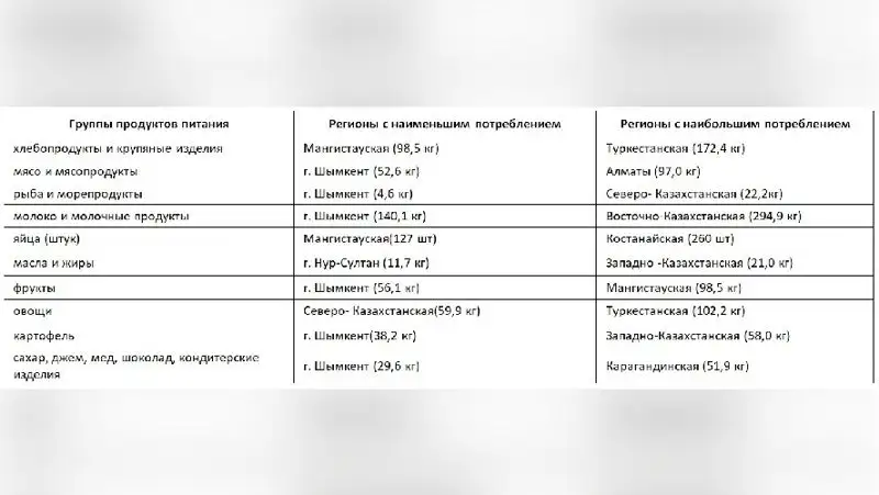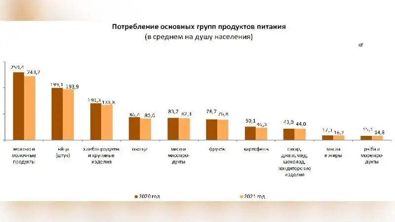 В среднем за месяц 2021 года потребление по отдельным видам продуктов питания на душу населения составило: картофеля – 3,9 кг, хлеба пшеничного из муки первого сорта – 2,8 кг, говядины – 2 кг, яблок – 1,6 кг, риса, сахара-песка – по 1,3 кг, молока сырого, кефира – по 1,3 л, яиц – 16,2 штук, макарон – 0,9 кг, рыбы свежей или охлажденной – 0,8 кг, чая черного – 0,1 кг.Бюро национальной статистики